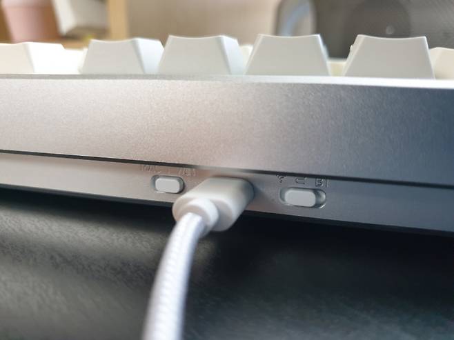 유선 연결은 유선 변경 스위치에 맞춰 놓고, 착탈식 C 타입 케이블로 키보드 전원 포트에 연결하