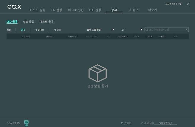 개봉해 보니 COX 각인된 덮개 및 비닐 포장된 키보드가 보이고, 스티로폼으로 고정되어 있네요.