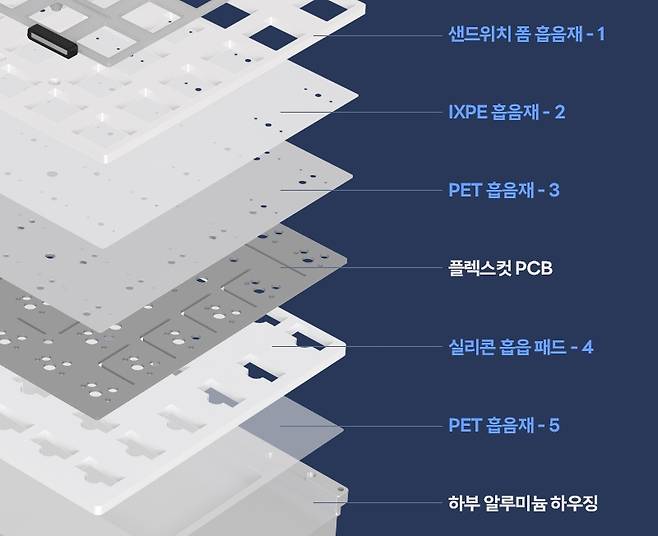 5중 레이어 장착의 흡음 설계 및 가스켓 장착으로 안정적인 타건감과 통울림을 최소화했습니다.