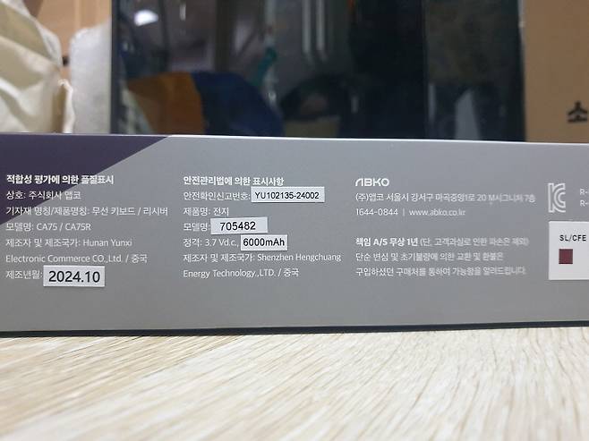 측면에는 모델명, 제조년월, 앱코 연락처, 보증 1년, 갈색(카라멜 커피 스위치) 표기가 있습니다.