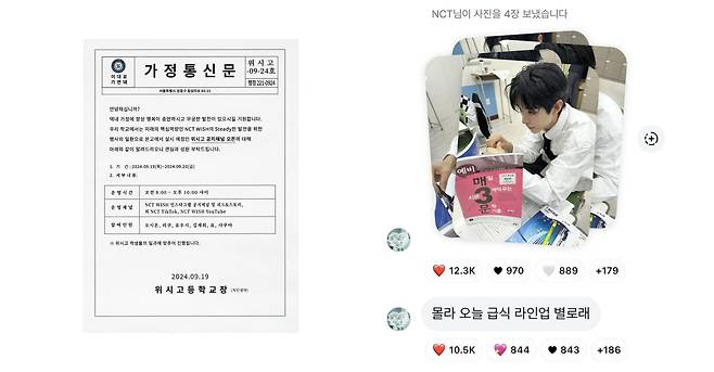 NCT WISH는 ⟪가정통신문⟫이라는 제목으로 인스타그램과 X에 인스타그램 공지 채널 개설을 예고했는데요. 학생들에게 익숙한 가정통신문 디자인을 차용한 이미지로 호기심을 유발했습니다. 이어 공지 채널에선 교복을 입고 있는 멤버들의 사진과 채팅이 올라왔는데요. ‘등교완’, ‘풋살ㄱ’, ‘헐 맞다 수행’ 등 친근한 말투와 ‘생선 손질하는 방법’ 등 유명 밈을 패러디한 영상까지 완벽하게 고등학생으로 변신한 모습으로 웃음을 자아냈습니다. 실제 고등학생들의 학교 생활 시간에 맞게 등교, 쉬는 시간, 점심시간, 하교까지 시간대별로 업로드되는 정성 가득한 디테일로 팬들의 과몰입을 유발하는 훌륭한 프로모션이었습니다.