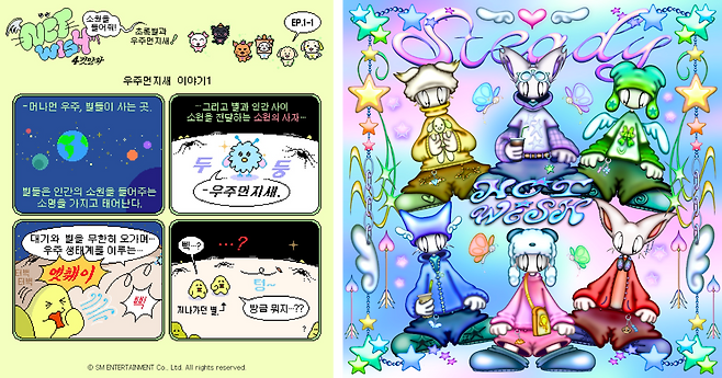 작가분들과의 활발한 협업 역시 이번 컴백 프로모션의 중요한 포인트인데요. 도트 느낌의 그림체로 유명한 OOO 작가와 WISH의 세계관 스토리를 구상한 김호애 작가의 협업으로 제작한 4컷 픽셀 만화 ‘소원을 들어줘! 초록별과 우주먼지새!’를 공식 인스타그램과 X에서 연재했습니다.