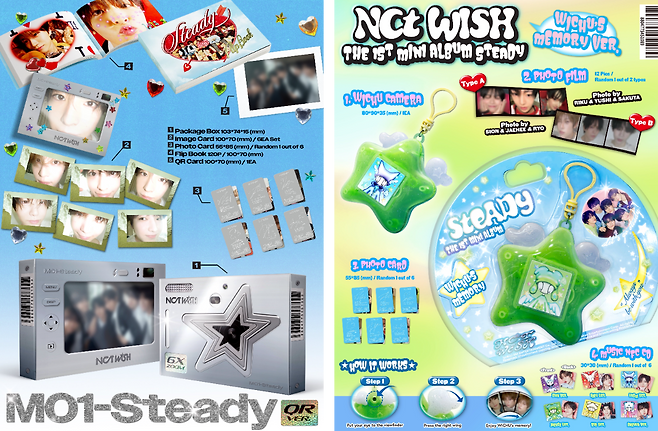최근 케이팝 내에선 CD 없이 QR이나 NFC 등으로 음원을 재생할 수 있는 다양한 형태의 앨범이 등장하고 있는데요. NCT WISH 역시 지난 활동에서 인형 키링 모양의 앨범을 선보인 바 있죠. 이번 [Steady]는 그중에서도 본 적 없는 형태의 색다른 앨범 디자인으로 또 한 번 크게 주목받았습니다. 좋은 반응을 얻으며 팬들의 소장 욕구를 자극한 두 버전을 함께 살펴보겠습니다.