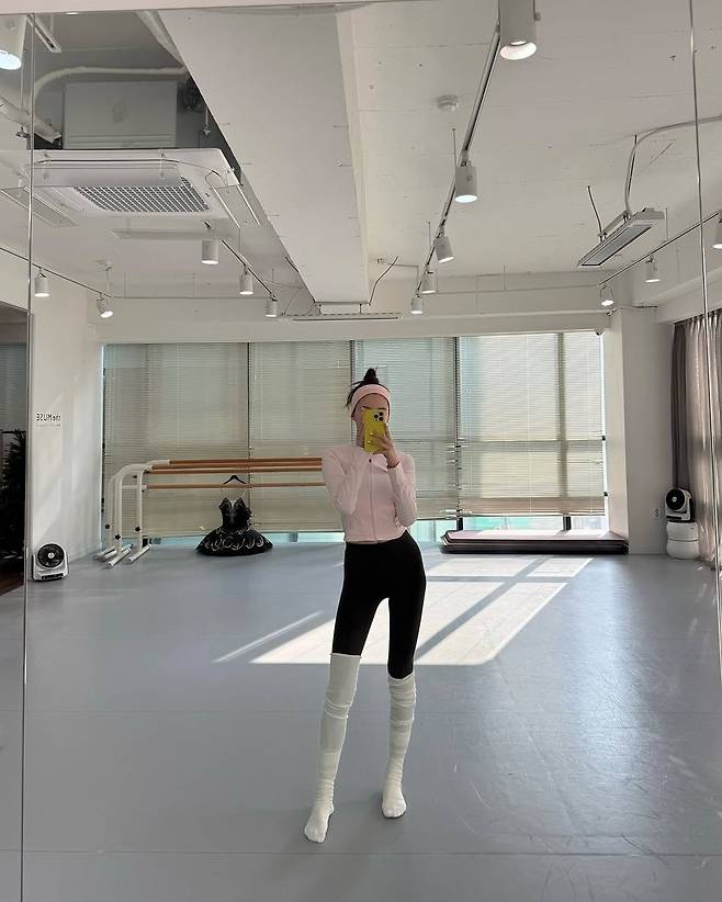 세 번째 이미지에서는 결혼 준비와 더불어 꾸준히 자기 관리를 이어가는 그녀의 모습이 담겼다. 발레 연습실로 보이는 공간에서 핑크 컬러의 집업 탑과 블랙 레깅스, 그리고 화이트 니 삭스를 매치해 트렌디한 발레코어룩을 완성했다. 슬림한 실루엣을 강조하는 이 착장은 그녀의 운동 루틴과 더불어 웨딩을 앞두고도 일상을 성실히 살아가는 모습까지 보여준다.