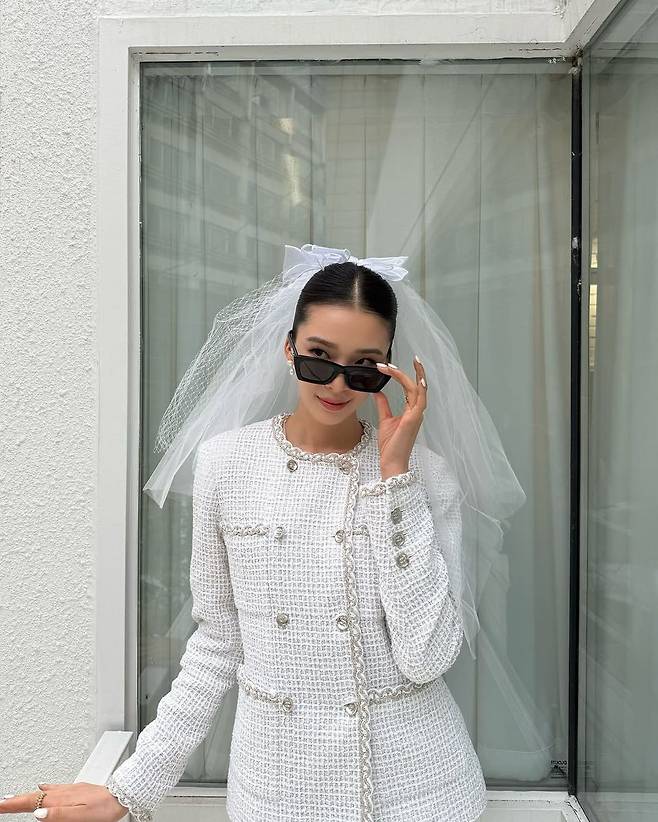 첫 번째 스타일은 클래식한 트위드 재킷에 베일과 리본을 매치한 신부룩이다. 구조적인 어깨라인과 은은한 장식 버튼이 고급스러운 이미지를 더하며, 여기에 블랙 선글라스를 더해 아이린 특유의 쿨한 감성이 묻어난다. 전통적인 신부의 이미지에 모던한 감각을 접목한 이 룩은, 결혼식 전 스냅촬영 또는 브라이덜 샤워 룩으로도 손색없다.