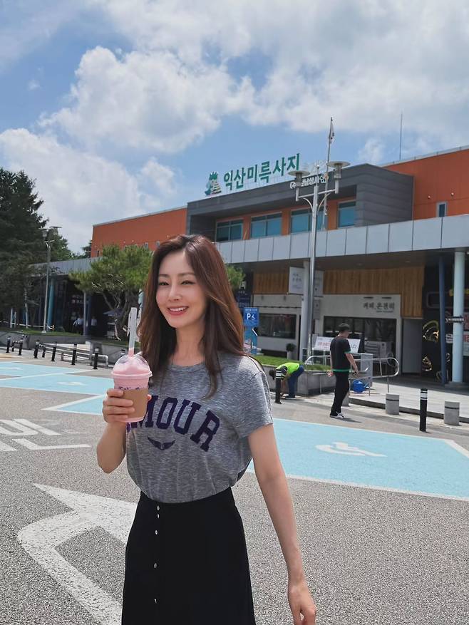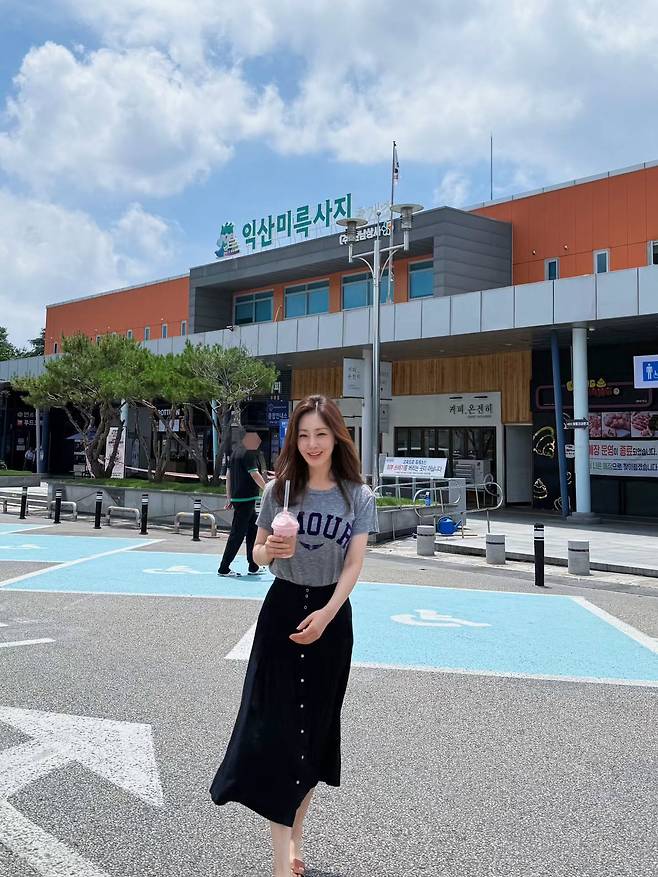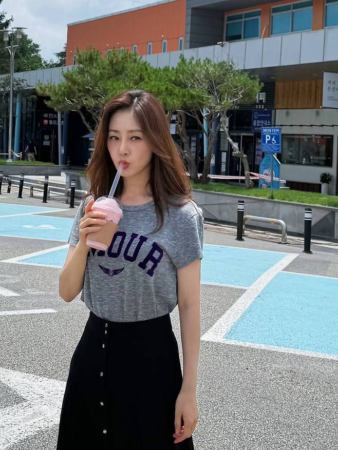 오나라는 회색 멜란지 티셔츠에 검정 버튼 롱스커트를 매치해, 깔끔하면서도 생기 있는 썸머룩을 완성했어요.