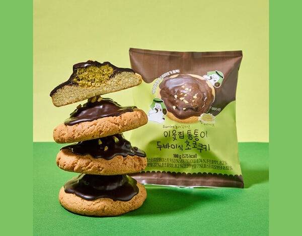 편의점 CU는 ‘이웃집 통통이 두바이식 초코쿠키’를 출시했다. CU가 출시하는 두바이식 초코쿠키는 압구정 인기 카페인 ‘이웃집 통통이’와 합작해 만든 상품이다. 손바닥 크기의 버터 쿠키 위에 잘게 부순 카다이프면을 섞은 피스타치오 스프레드 크림을 올린 뒤 초콜릿으로 덮은 상품이다. 피스타치오 100%를 갈아 스프레드를 만들어 두바이 초콜릿 특유의 달콤 쌉싸름한 맛과 부드럽고 바삭한 식감을 살렸다. 가격은 3,600원이다.