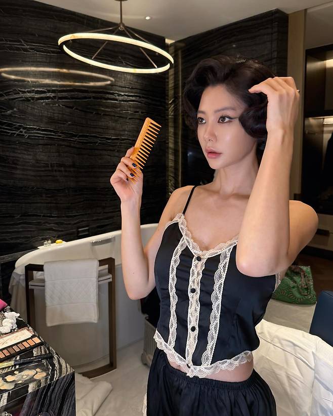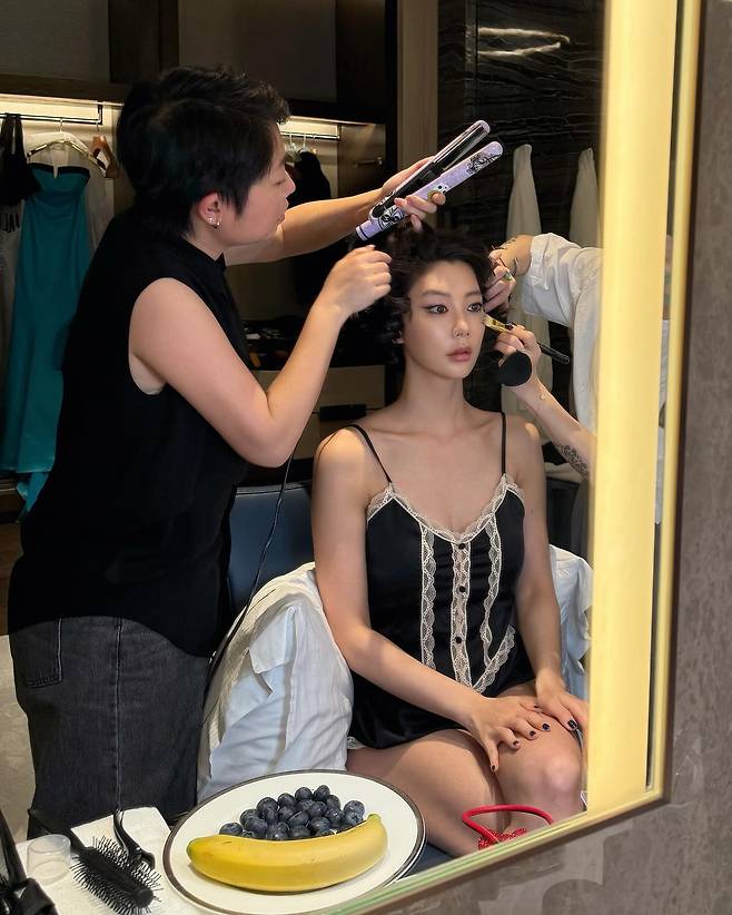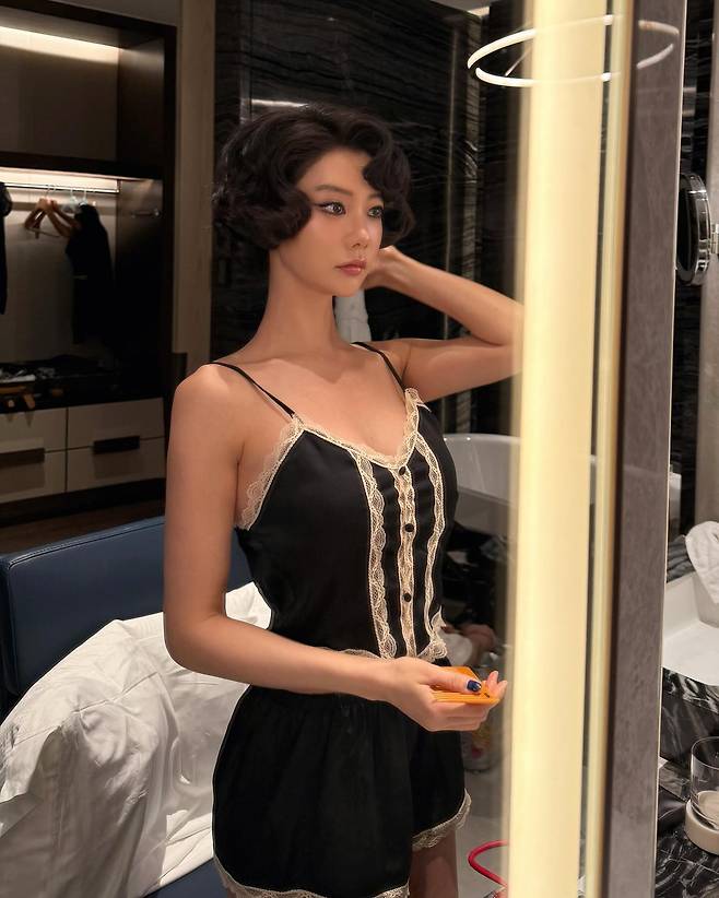 특히 시선을 끌었던 건 뷰티룸에서 포착된 그녀의 속옷 스타일링. 레이스 디테일이 강조된 슬립 웨어와 함께 과감하게 연출한 볼륨 헤어, 매끈한 피부 표현까지 마치 영화 속 한 장면처럼 완성됐어요.