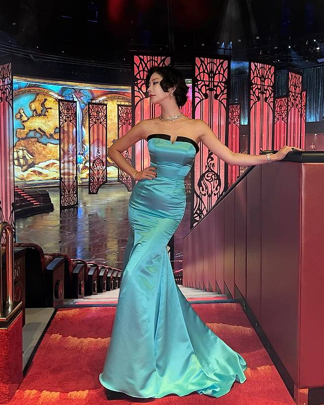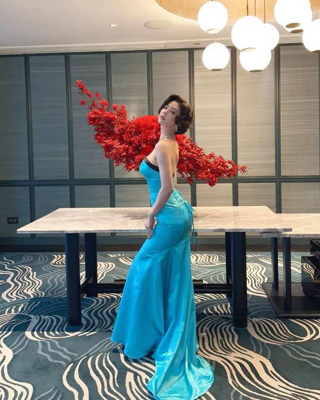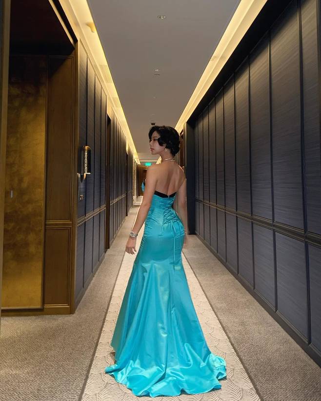 바디라인을 드러내는 하늘빛 새틴 드레스는 단순히 화려한 드레스를 넘어서, 조각처럼 정제된 실루엣과 절묘한 컬러감으로 그녀만의 아우라를 극대화했죠