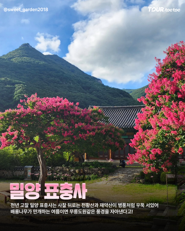 천황산과 재약산에 둘러싸인 밀양 표충사는 임진왜란 당시 승병의 호국정신을 기리는 천년고찰로 여름이면 화려한 배롱나무가 만개랑하는 배롱나무 명소입니다.