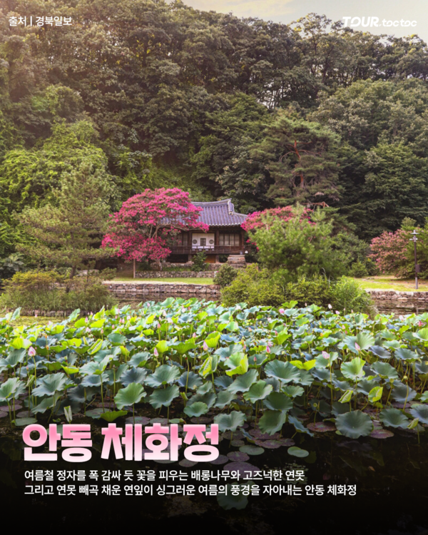 병산서원 인근에 위치한 안동 체화정은 조선시대에 세워진 정자입니다. 여름이면 양 옆의 배롱나무가 풍성하게 피어나 정자를 감싸며, 앞의 인공 연못과 연잎이 싱그러운 풍경을 완성합니다. 규모는 작지만 운치 있는 공간으로 고즈넉하고 한적한 여름 명소를 찾고 있으셨다면 추천드리는 배롱나무 명소입니다.