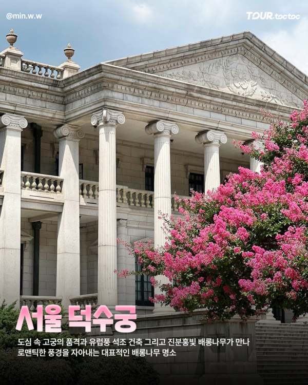 서울 한복판에 위치한 배롱나무 명소 덕수궁입니다. 근대 건축물과 한국 전통미가 조화를 이루는 덕수궁은 여름이면 3그루의 배롱나무가 화려한 분홍빛 꽃을 피웁니다.