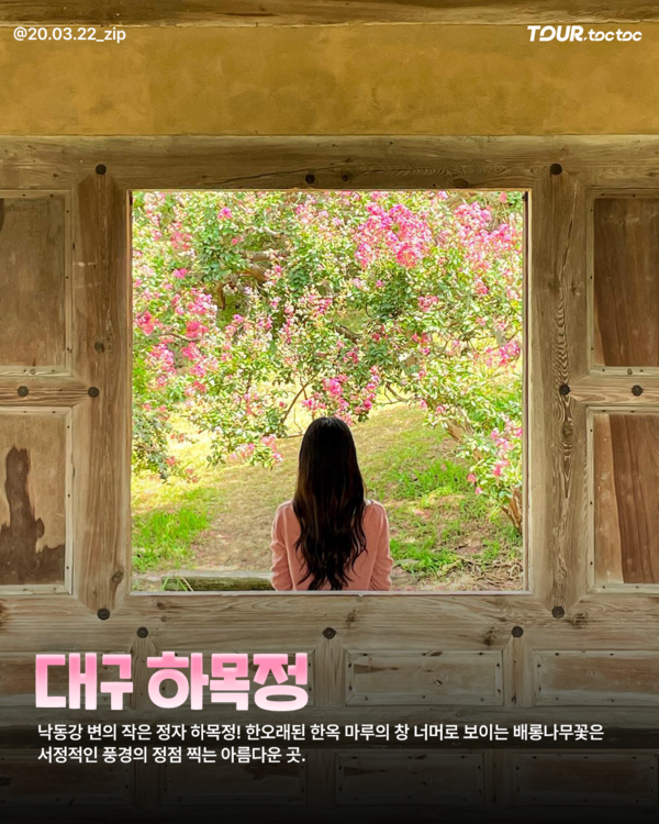 조선 선조 때 의병장 이종문이 지은 대구 하목정은 규모는 작지만 한옥과 배롱나무, 그리고 낙동강 풍경이 어우러진 명소입니다.