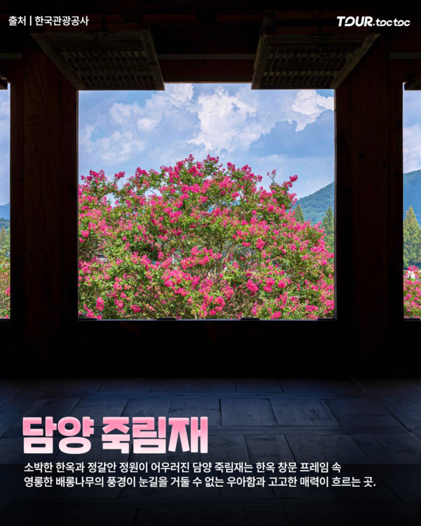 담양 죽림재는 조선 후기 학자 송시열의 제자 이직재가 학문을 닦던 곳으로, 소박한 한옥과 정갈한 정원, 그리고 담장 너머로 보이는 배롱나무가 조화를 이룹니다.작지만 세련된 고택 풍경과 함께 감성적인 사진을 남기기에 좋은 배롱나무 명소로 추천드립니다.
