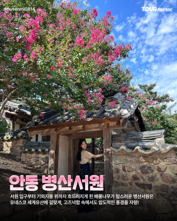 유네스코 세계문화유산으로 등재된 병산서원은 조선시대 선비들의 학문과 정신이 깃든 공간입니다. 여름이면 입구부터 서원 안쪽까지 줄지어 선 배롱나무들이 붉은 꽃을 피워 장엄한 풍경을 만듭니다.