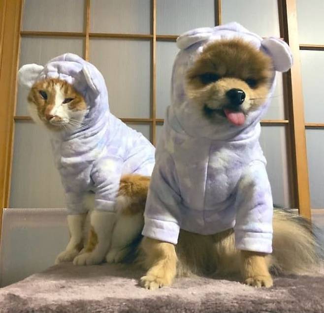 또 본가는 겨울에 너무 추워서 강아지와 고양이 모두 옷을 입지 않으면 견디기 힘들 정도였다고 합니다. 고양이는 처음에는 옷 입기를 싫어했지만 한 번 추운 겨울을 겪고 나서는 얌전히 옷을 입게 되었다고 합니다.