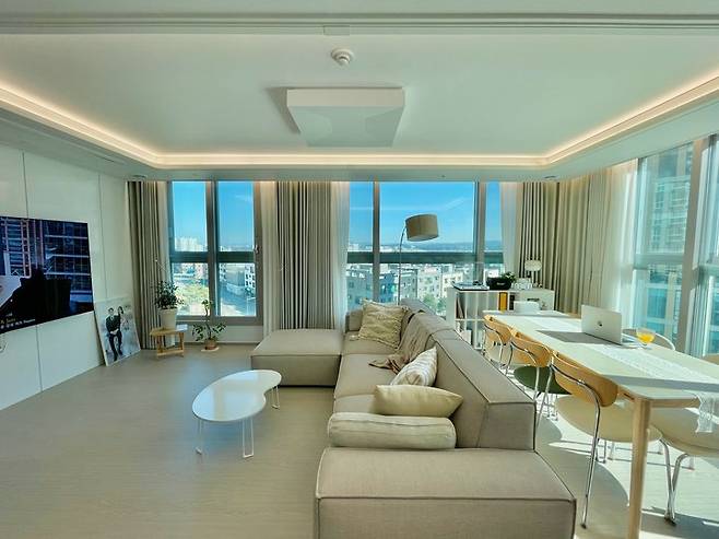 저희 집 거실입니다. 위에서 설명드렸다시피 양면창에 광폭 거실이 포인트인 집이에요. 그래서 소파를 거실 중간에 라운지 느낌으로 두었고, 뒤쪽에 식탁을 배치하여 넓게 공간을 활용할 수 있게 되었어요.