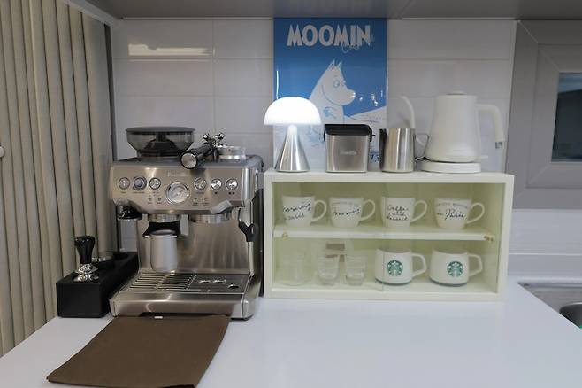 우선 홈카페 공간 빈 곳에 파란색 포인트가 되는 액자를 세워두어 통일감 있는 포인트를 주었어요. 그렇게 배치 해 보니 브레빌 커피 머신의 스틸 분위기와도 잘 어울리는 세련된 느낌의 인테리어가 되는 느낌이었어요.