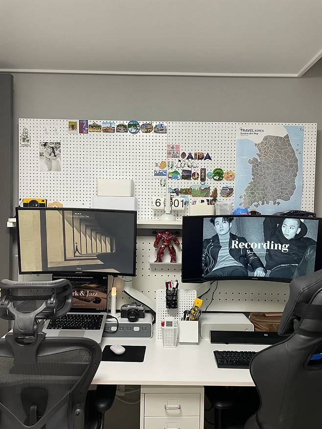 평소 마그넷을 모으는 남편을 위해 타공판으로 우리의 추억을 보관해두었고, 모니터 암으로 양옆으로 모니터를 설치하여 옆에서 나란히 함께 즐길 수 있는 공간을 만들었습니다. 중간에 이케아 서랍장을 사용하여 공간 분리 및 작은 용품들을 보관해 주고 있어요.
