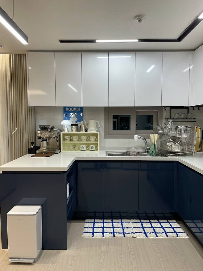 그리고 발판도 파란색 그리드 모양으로 맞추어 파랑파랑한 느낌을 그대로 가져가 주었어요. 제가 좋아하는 무민 포스터도 올려주었고 포인트로 컵 장식장과 도마 등으로 살짝 노란색 포인트를 주었더니 나름대로 잘 어울리는 느낌 아닌가요? :)