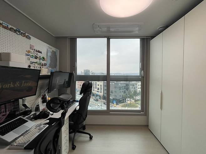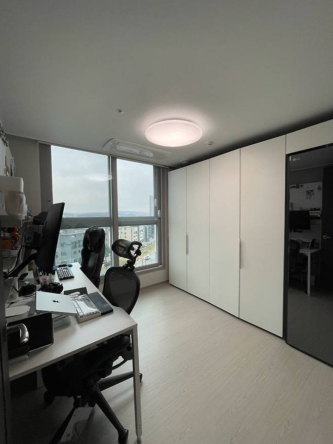 저희 집 작은방입니다. 작은방은 드레스룸과 작업실을 함께 사용하고 있어요. 동향의 창이 있어 낮에는 쾌적한 하늘을, 밤에는 멋진 야경을 볼 수 있는 공간이에요.