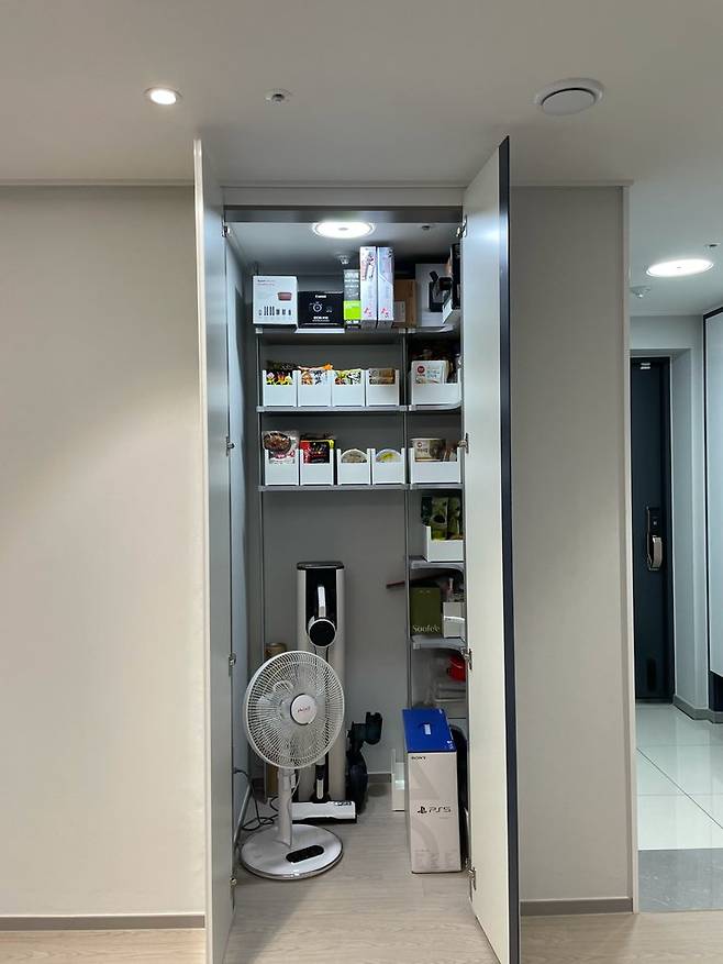 한쪽 면은 음식 관련 수납을 했고, 옆쪽은 청소 용품이나 평소 쟁여두는 물품들을 보관해두었어요. 손이 제일 가지 않는 제일 꼭대기 층은 중요한 물건들의 용품을 박스채 보관해두었습니다.