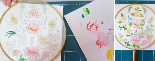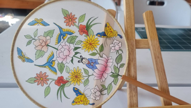 비단부채 체험에는 한국화 물감을 사용하는데 수채화 물감과 다르게 색이 더 쨍한 게 특징이다. 한국화 물감의 안료 중 하나로 천연 광석을 분쇄해 광택이 나는 석채(石彩)를 사용하기에 이런 특징이 두드러진다. 마른 뒤에는 물이 묻어도 번지지 않는다는 것도 큰 장점이다.