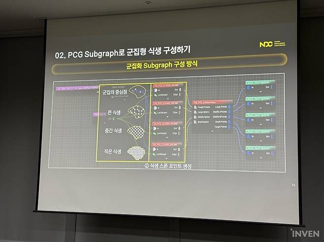 김경환 TA는 아티스트들이 쉽게 쓸 수 있도록 이 기능들을 서브그래프에 하나로 묶었다. 이 서브그래프트는 맨 처음 스플라인 데이터를 월드에서 들고 온다. 이어서 스플라인 데이터를 스플라인 샘플에 연결한다. 이어서 포인트를 생성하면 그 포인트를 선택해서 나무도 심고 풀도 자라게 하는 식이다. 핵심은 포인트의 밀도를 정의하는 것으로 군집의 중심점을 만들어야 한다. 큰 식생은 중심점 반경 2M 이내로 자라고 2M~10M는 중간 식생이 10M~20M는 전역적 식생이 자라도록 하는 식이다.