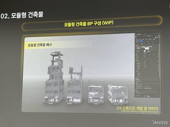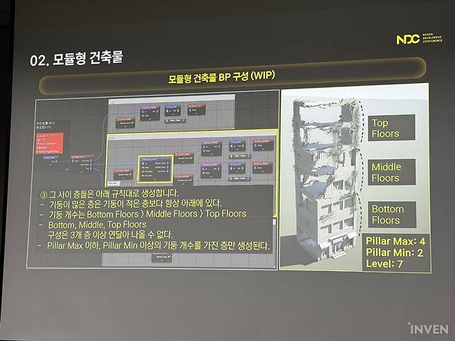 여기에 복잡한 로직을 더하면 모듈형 건물도 만들 수 있다. 몇 층짜리인지, 높이는 얼마나 높은지, 옥상이 존재하는지 등 건물 파라미터에 입력하면 끝이다. 이를 통해 앞서 자연스러우면서도 중복되지 않는 식생을 만든 것처럼 부서진 다양한 건물들을 만들 수 있다.