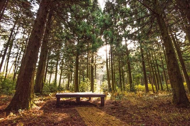 쭉쭉 뻗은 삼나무와 편백나무가 하늘을 가리고, 서어나무, 졸참나무 등 피톤치드 가득한 활엽수들이 어우러져 숲의 탐방을 더욱 활기차게 만들어준다.