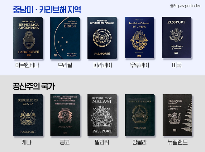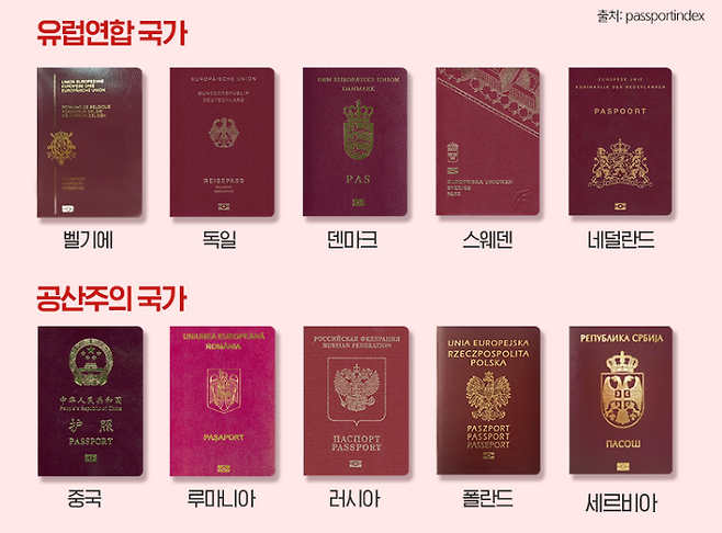 국가별로 여권의 색깔은 크게 붉은색, 녹색, 파란색, 검은색 계열 등 4가지로 나뉩니다. 비슷한 여권 색상을 가진 국가들은 지정학적, 이념적, 종교적인 공통점을 찾을 수 있다곤 하지만, 미국여권과 북한여권 모두가 파란색이란 것을 보면...