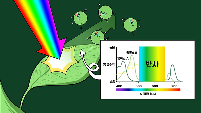 식물의 잎은 대개 초록색입니다. 그 이유는 빛 에너지를 화학 에너지로 전환하는 녹색 색소인 엽록소가 주로 흡수하는 빛의 파장이 청색(400nm)과 적색(700nm) 영역이고, 초록색 영역(500~600nm)은 대부분 반사하기 때문입니다.