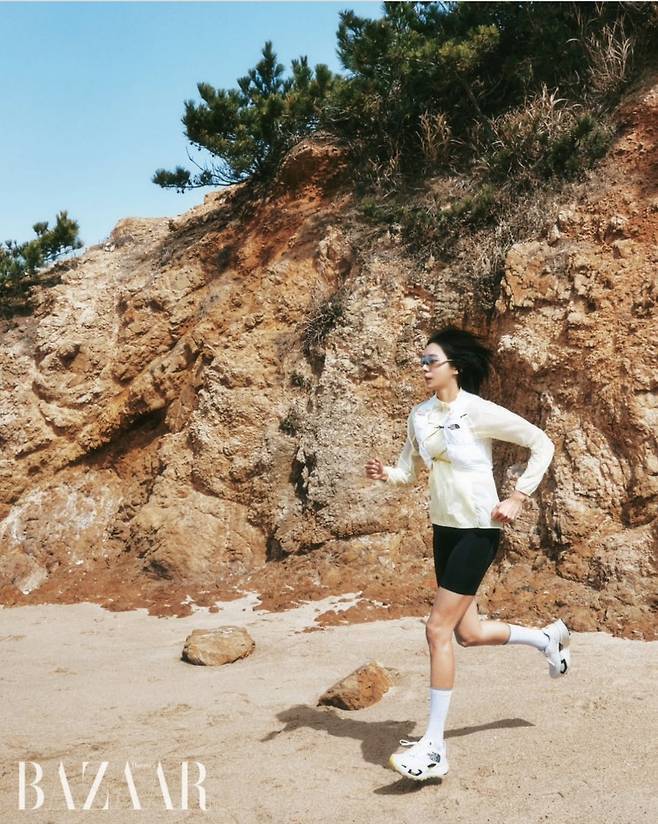 특히 러닝 베스트와 무릎 아래까지 오는 블랙삭스로 마무리한 룩은 유이만의 도시적이면서도 트렌디한 해변 러너 감성을 극대화했습니다.