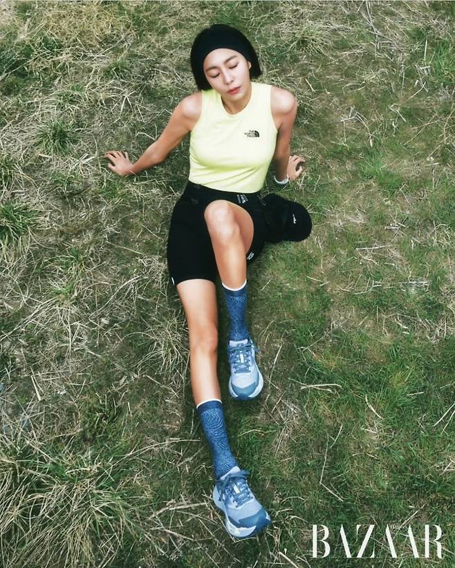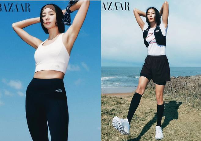 블랙 하이웨이스트 레깅스에 화이트 크롭탑을 매치한 첫 컷에서는 탄탄한 복근 라인이 시선을 압도했고, 노란 민소매와 바이커 쇼츠로 완성한 스타일에서는 긴 다리 라인이 더욱 강조됐습니다.