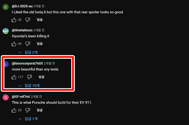 특히 디자인은 해외 네티즌들의 열광을 불러일으킨 핵심 포인트였다. 블랙 컬러와 후면 스포일러가 강조된 아이오닉 6 N의 외관은 “기존 모델보다 훨씬 세련됐다”는 평가를 받았다. 유튜브 사용자 @lancecorporal7605는 “테슬라보다 아름답다”는 댓글을 남겨 수백 개의 공감을 받았고, 또 다른 사용자는 “포르쉐가 이렇게 만들었어야 한다”며 감탄을 감추지 못했다. 현대차가 글로벌 디자인 경쟁에서 한 단계 도약했다는 증거로 읽힌다.