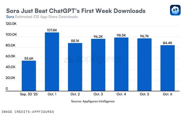 테크크런치는 앱 분석업체 앱피규어스(Appfigures) 자료를 인용, 소라가 출시 후 첫 7일 동안 iOS 기준 약 62만7천 건이 다운로드됐다고 보도했다. 이는 챗GPT가 같은 기간 기록한 60만6천 건을 웃도는 수치다.