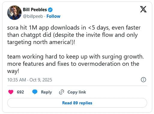 이 기사 공개 직후, 오픈AI 소라 총괄 빌 피블스(Bill Peebles)는 소라가 출시 5일도 채 되지 않아 다운로드 100만 건을 돌파했다고 밝혔다. 그는 “초대받은 사용자만 접근 가능한 제한적 형태(invite-only)임에도 챗GPT보다 빠른 성장세를 보였다”고 덧붙였다. 현재 소라는 iOS에서만 이용 가능하다.