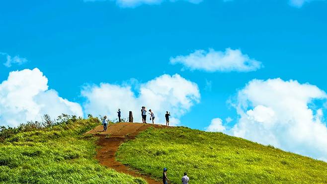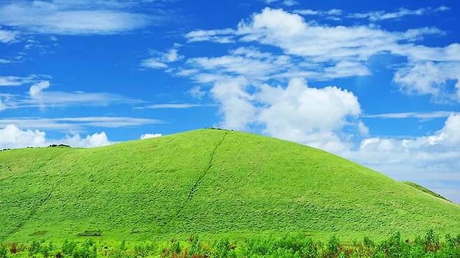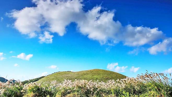계절마다 옷을 갈아입는 이곳의 풍경은 매 순간이 절정이라 할 만큼 아름답습니다. 특히 10월이면 은빛 억새 군락이 오름 전체를 뒤덮어 바람이 불 때마다 거대한 파도가 일렁이는 듯한 장관을 연출하며 가을의 정취를 더합니다.