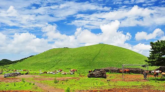 제주 서부 중산간의 광활한 대지 위에 우뚝 솟은 새별오름은 그 이름처럼 저녁 하늘에 외롭게 떠 있는 샛별을 닮아 신비로운 분위기를 자아냅니다.