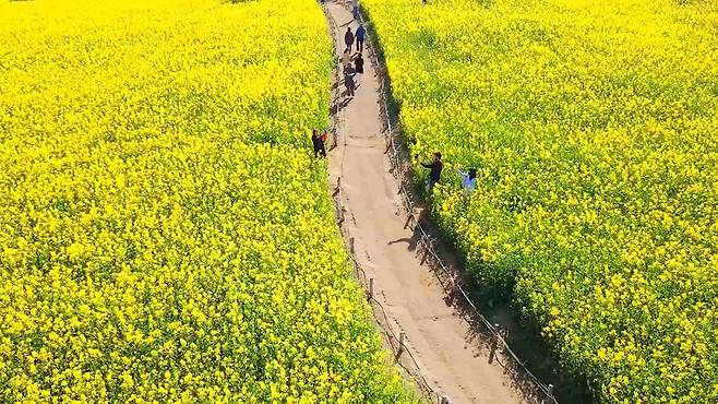 유채꽃밭 사이로 정성스럽게 조성된 길을 따라 걷다 보면 고풍스러운 사당과 울창한 대나무 숲길을 지나 꽃밭 정상부 전망대에 이르게 됩니다.