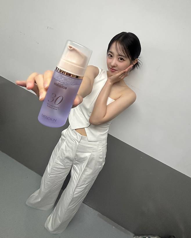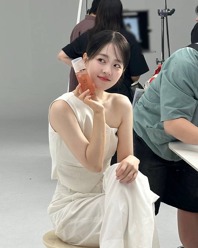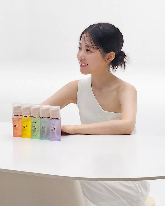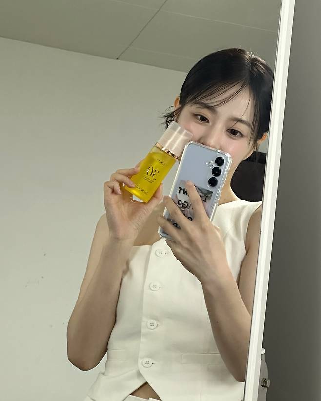 작은 소품처럼 손에 쥔 컬러 보틀까지도 얼굴 대비를 극대화해 시선을 의도적으로 끌어당겨요.