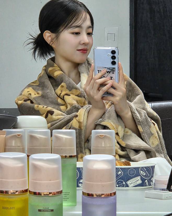 펄 없이 맑은 메이크업, 낮게 묶은 번 헤어가 전체 룩에 투명한 질감을 얹어줘요.