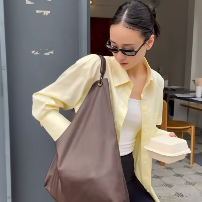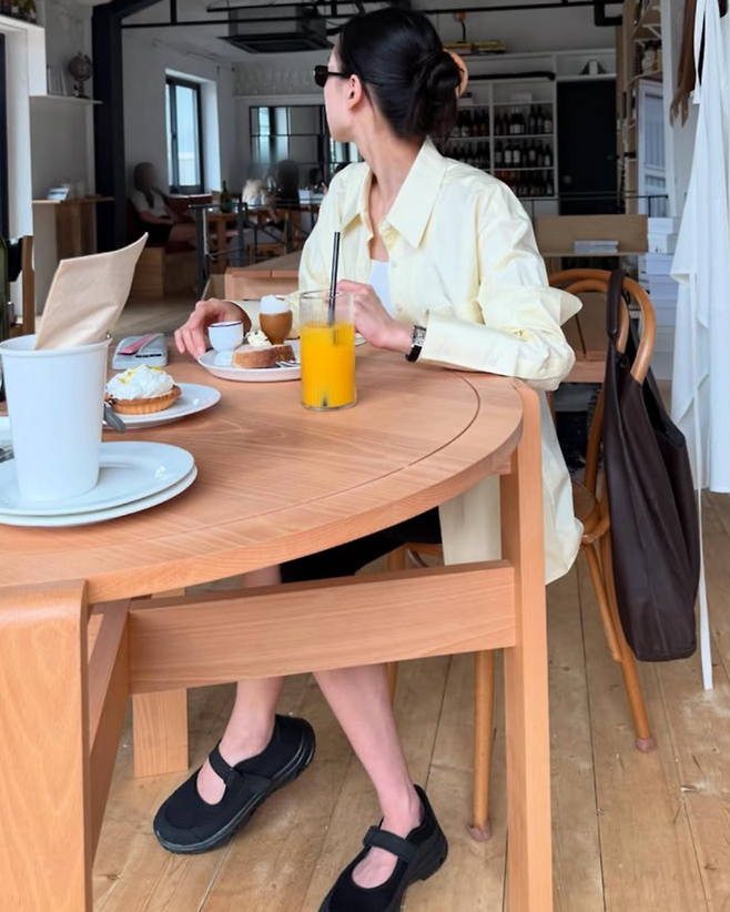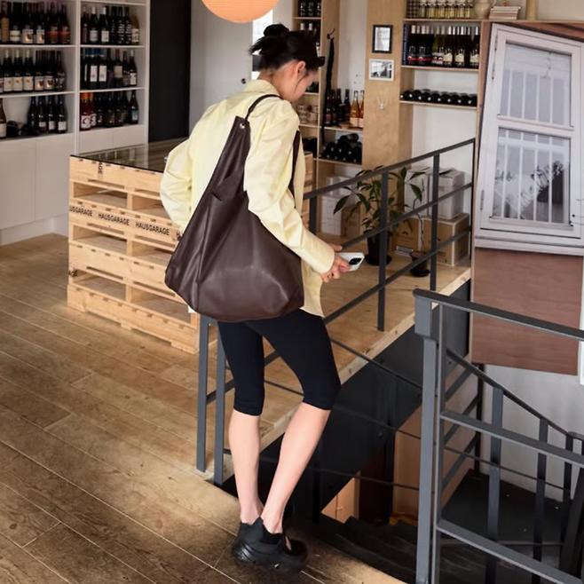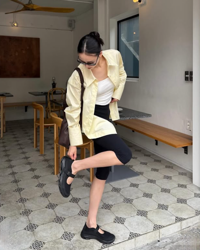 심플한 레몬 컬러 셔츠는 햇살과 찰떡같이 어울리고, 슬리브리스 이너와 블랙 바이커 쇼츠는 스타일과 활동성을 동시에 잡은 선택. 편안한 샌들에 큰 가죽 숄더백까지, 누가 봐도 ‘맘룩’ 같지 않은 ‘핫맘룩’ 그 자체.