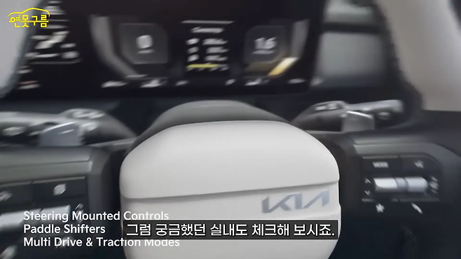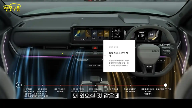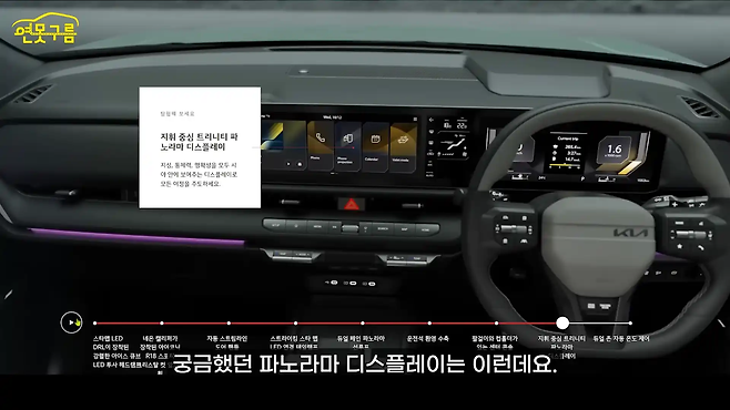 운전석 공간은 12인치 계기판, 12인치 인포테인먼트, 5인치 공조 디스플레이가 통합되어 EV9, EV6, EV3 등 최신 전기차 라인업과 유사한 레이아웃을 보여준다.