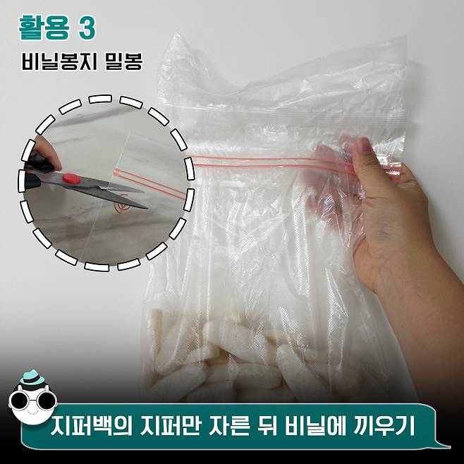 지퍼백의 ‘지퍼백’ 부분을 미리 오려두세요. 그 뒤 비닐봉지 위에 덧대어 지퍼백을 잠가주면 끝.