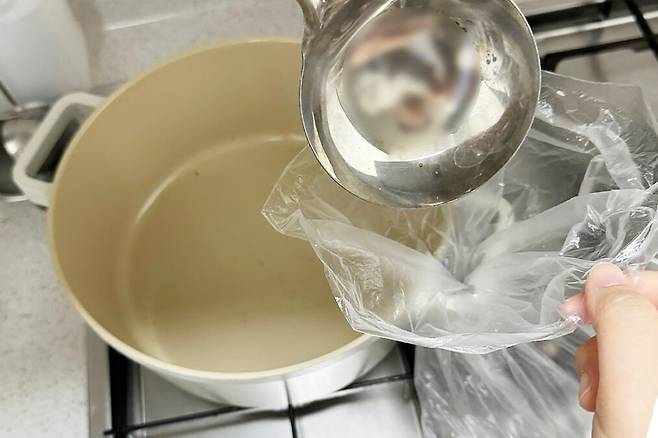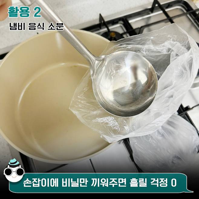 이때 냄비 손잡이에 비닐을 한번 끼워보세요. 국자에 국물을 떠서 옮기게 되면 꼭 조금씩은 흘리게 되는데, 이 방법을 활용하면 바닥에 흘리는 국물 하나 없이 알뜰하게 소분이 가능해요!