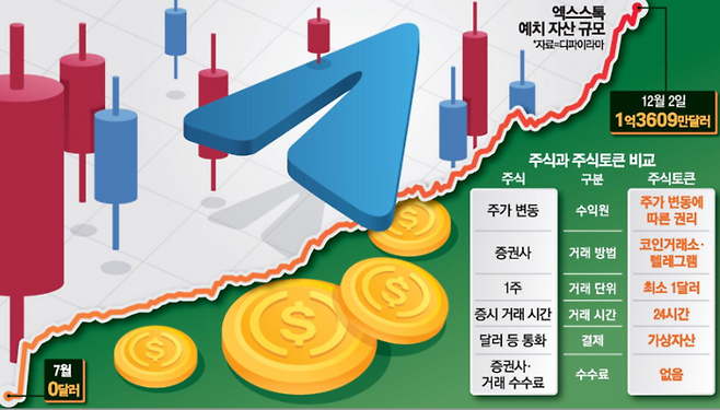 다만 실제 주식과 다른 점은 투자자들이 실제 주식을 소유하는 것이 아니라 중개기관이 발행한 토큰을 보유하며 기초 주식의 가치가 상승하거나 매각될 경우 지급금을 받을 수 있는 권리만 가진다는 점이다. 텔레그램에 자산을 두고 거래해야 하는 만큼 신뢰도 문제가 있다는 게 약점이다.