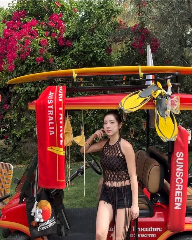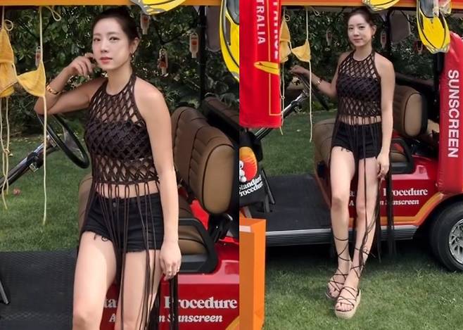 정순주는 블랙 크로셰 홀터넥 탑과 초미니 블랙 쇼츠로 감각적인 휴양지룩을 완성했습니다.
