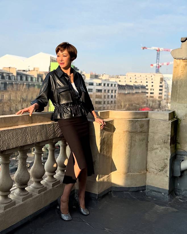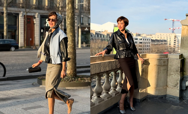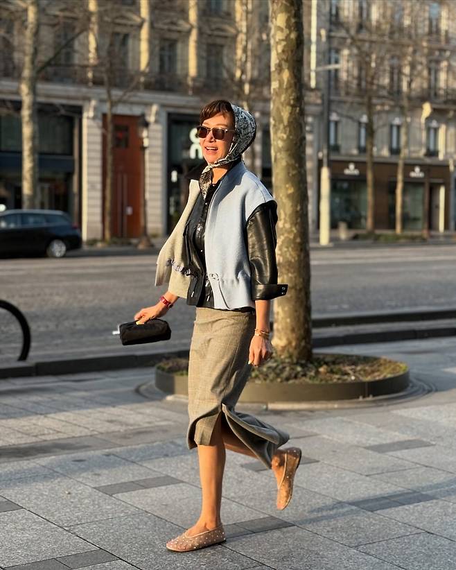 변정수는 트위드 소재의 슬릿 스커트와 블랙 레더 셔츠를 레이어드하고, 하늘색 베스트를 걸쳐 우아하면서도 클래식한 분위기를 연출했다. 머리에 두른 스카프는 유럽풍의 감성을 더하며, 누드 톤 플랫 슈즈는 편안함과 세련미를 동시에 살렸다.