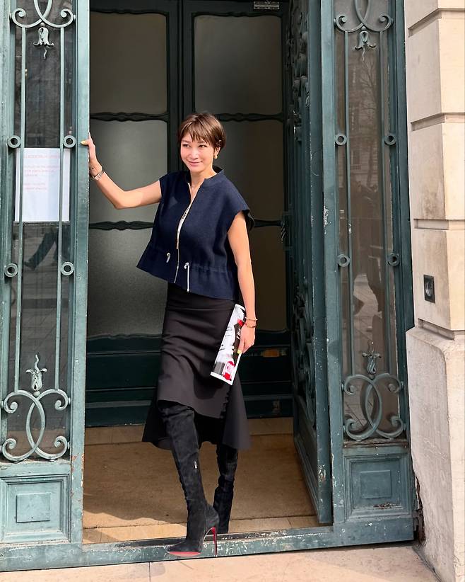 변정수는 블랙 슬릿 스커트와 네이비 집업 베스트를 매치해 간결하면서도 세련된 스타일을 연출했다. 무릎 위까지 올라오는 블랙 스웨이드 부츠는 다리 라인을 강조하며, 전체적인 룩에 고급스러움을 더한다. 손에 든 잡지는 액세서리처럼 활용되어 자연스러운 분위기를 자아낸다.